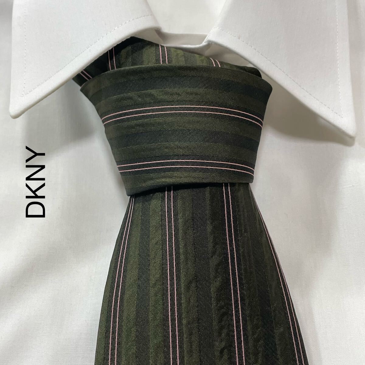 - DKNY ダナキャランニューヨーク 楊柳調 ストライプ シルク ネクタイ 日本製 カーキ ピンク TG1896