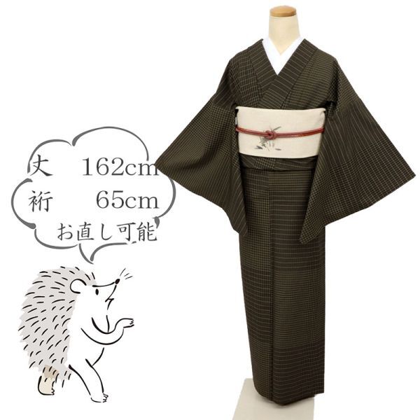 - 【塩沢お召】 単衣 特選 着物 小格子の市松模様 黒茶色 正絹 TC4-3