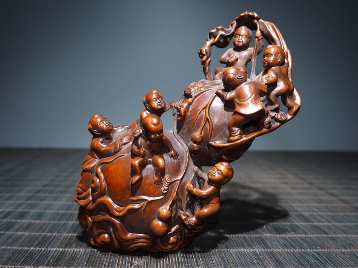- 蔵友旧蔵出 黄楊木製 細密彫 多子多福 ひょうたん 極細工 希少珍品 置物 古賞物 中国古玩 中国古美術品