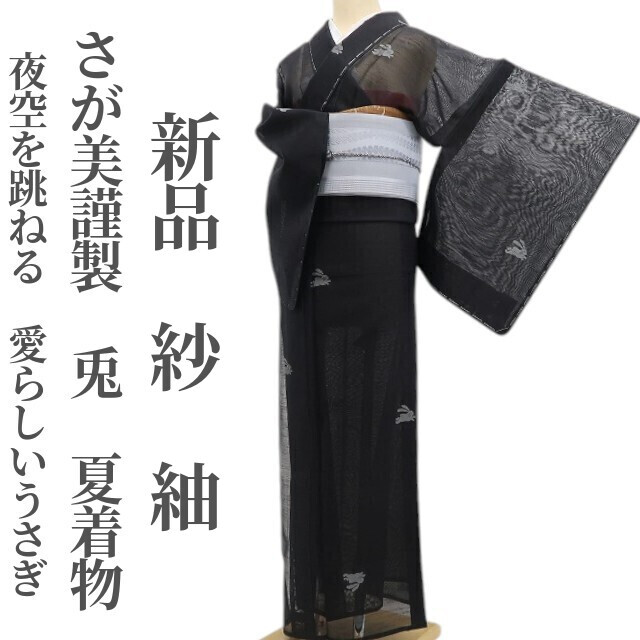 > tomihisa 新品 紗 さが美謹製 兎 夏着物 正絹 仕付け糸付”夜空を跳ねる、愛らしいうさぎ”紬 5996