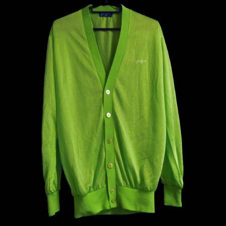- 古着屋購入 JACK PORT 黄緑/yellow green ポリエステル カーディガン L 小杉産業 KOSUGI 薄手 軽量 胸刺繍