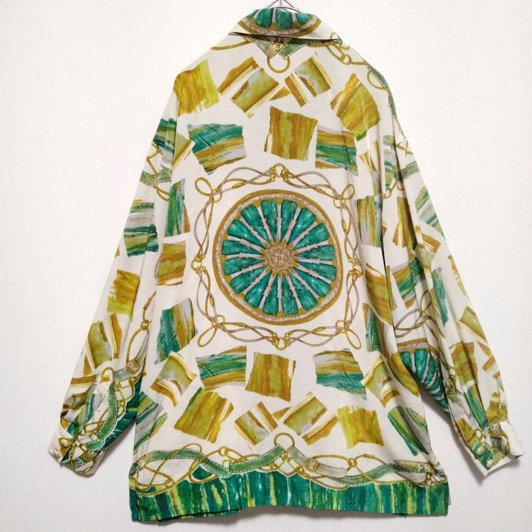 - レトロシャツ ヴィンテージ ベルト チェーン柄 スカーフ柄 グリーン 古着 長袖