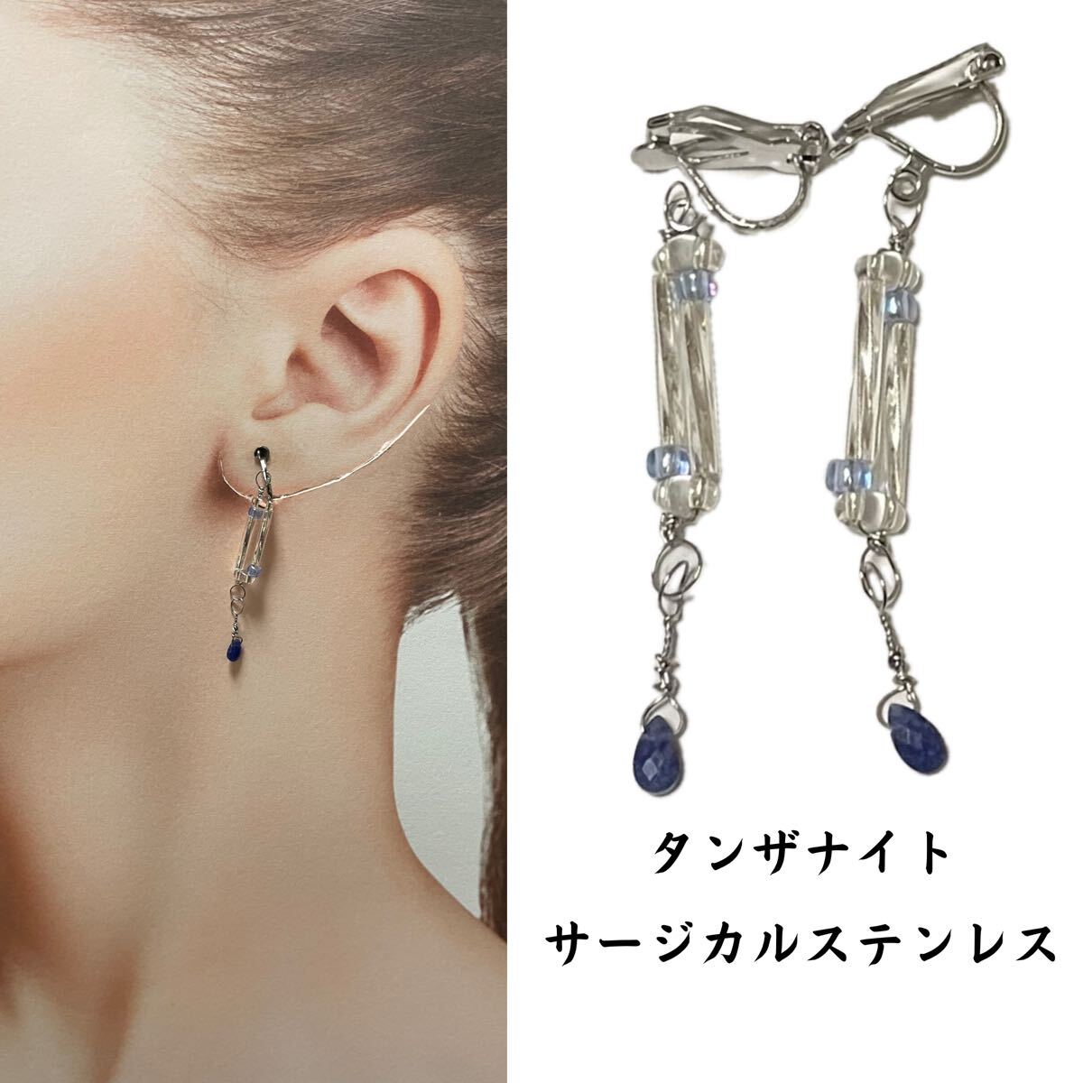 > W128. 天然石 イヤリング タンザナイト ハンドメイド サージカルステンレス アレルギーフリー ニッケルフリー