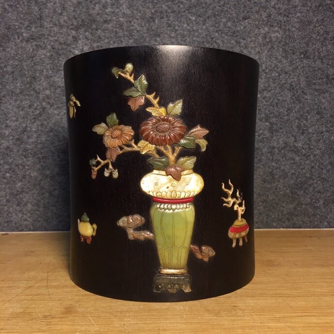 - 蔵友旧蔵出 紫檀木製 細密彫 百寶嵌 花瓶紋 筆筒 貴重物品 置物 賞物 中国時代美術品