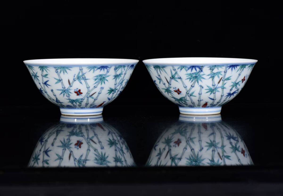 - 『館蔵珍品 明 成化年製款 古陶瓷品 斗彩 竹林紋 供碗一對 陶藝』稀少珍蔵品 古賞物 貴重物品 収蔵品 中国古美術 時代物 古董品