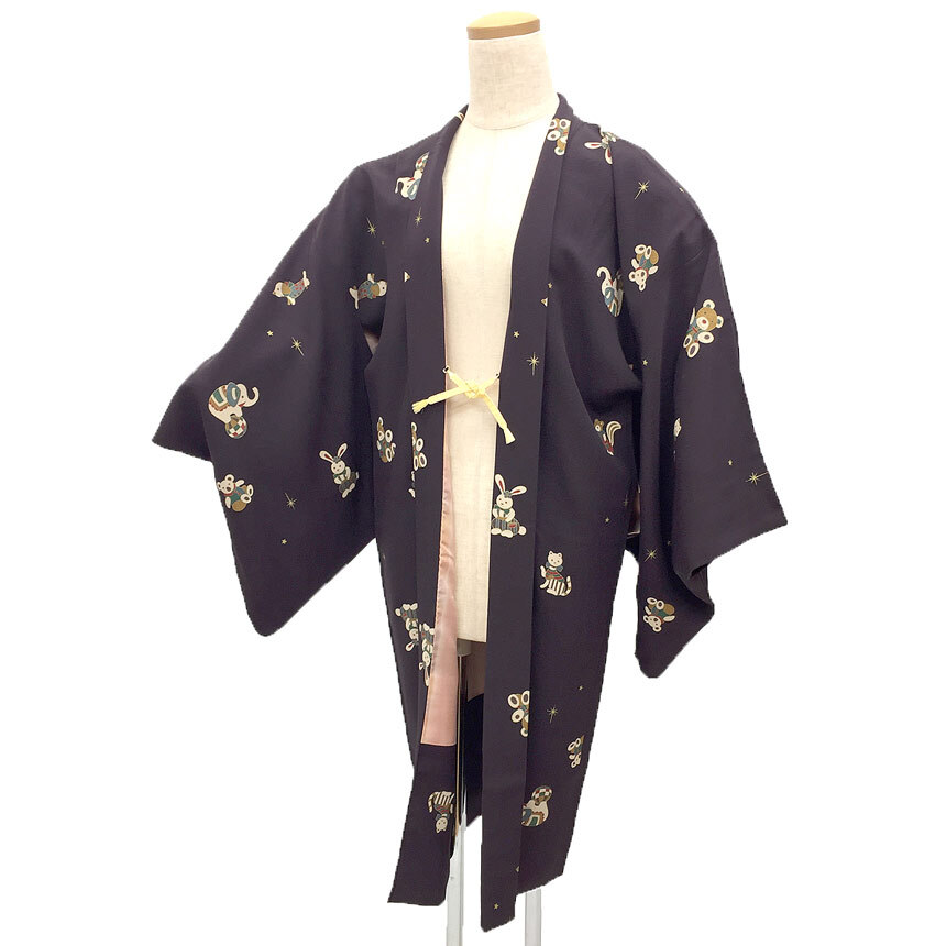 - 京やM430 正絹 長羽織 和装コート ロング丈 着物コート 羽織 道中着 袷仕立て 動物たちのサーカス うさぎ クマ ネコ いぬ ゾウ 星 道行