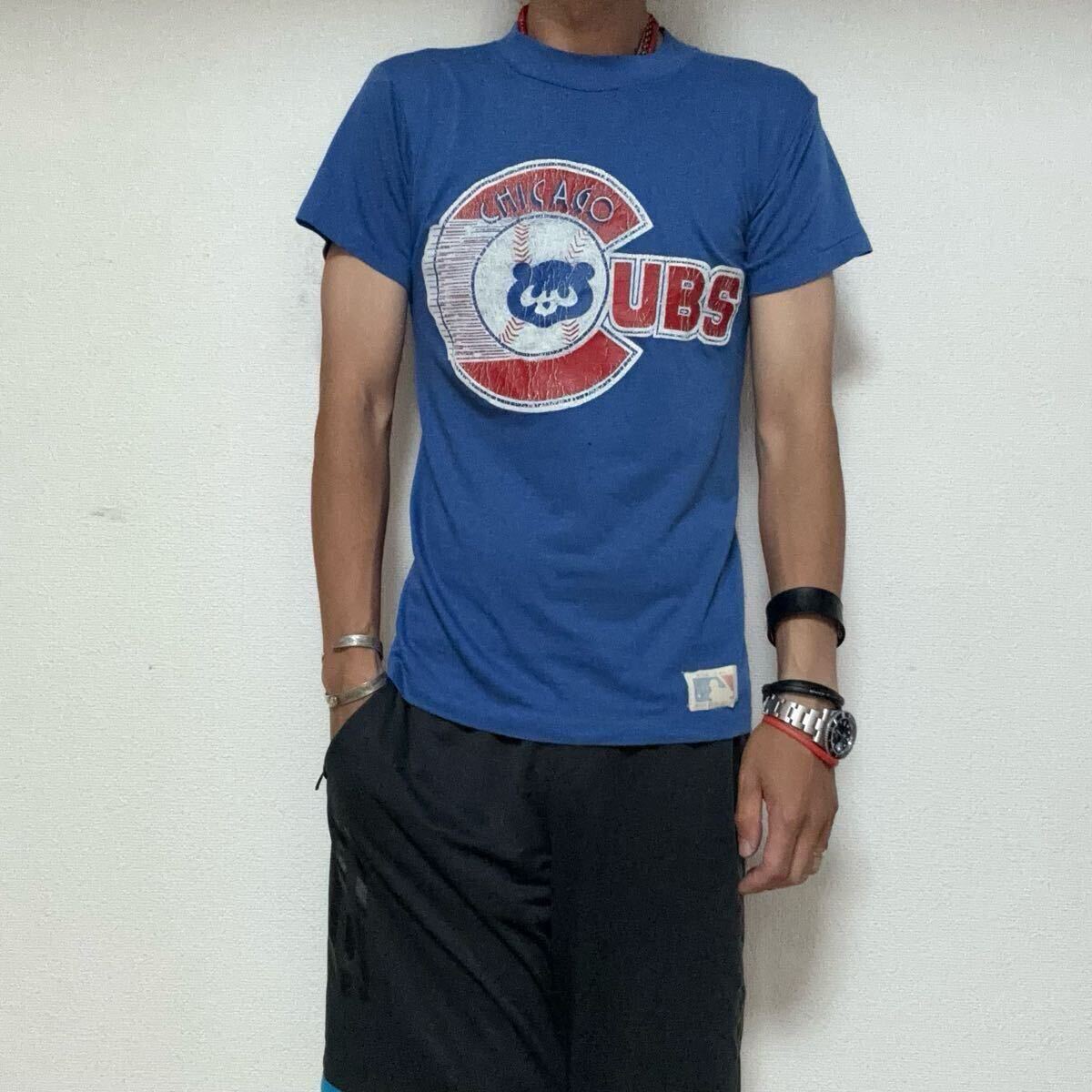 - ビンテージ80s USA製シカゴカブス プリントTシャツS袖裾シングルステッチsand-knit