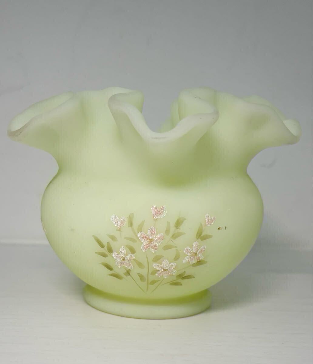 - 【美品】希少 イギリス購入 US製 フェントン フリル ヴァセリン カスタードカラー ウランガラス 器 花瓶 ガラス Fenton フラワーベース