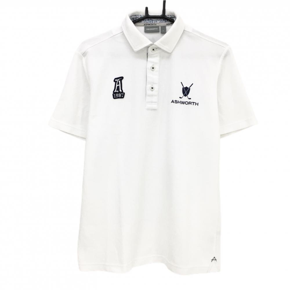 > アシュワース 半袖ポロシャツ 白 胸元ロゴ ネック・前立て内側花柄 メンズ L ゴルフウェア ASHWORTH
