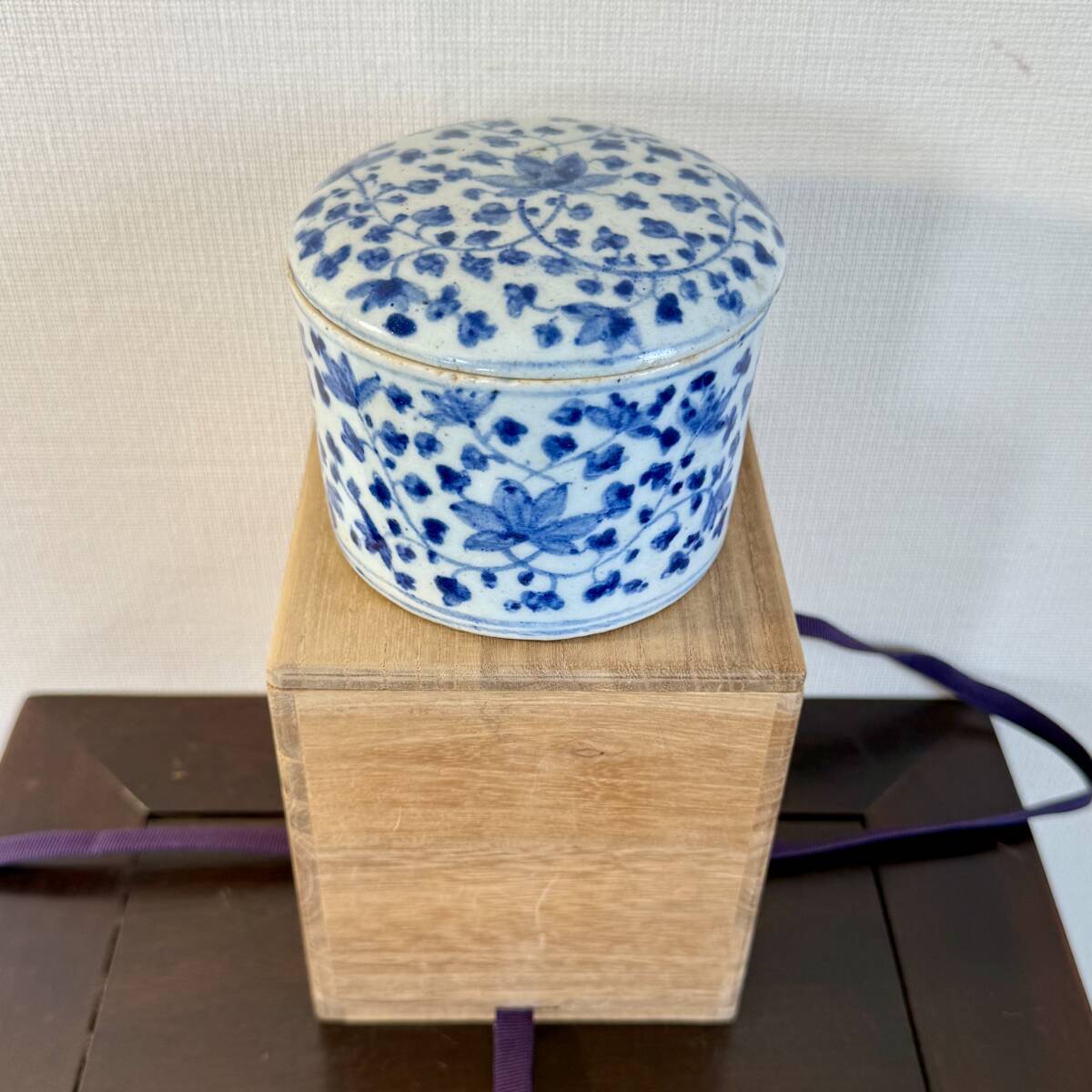 > 時代 中国美術 青花 染付 唐草文 蓋物 桐箱入 / 香炉 唐物 煎茶道具 茶器 古美術 骨董 古玩 古陶磁器 明時代 清代 明朝 清朝 茶道具 古染付