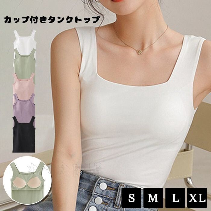 - タンクトップ カップ付き レディース 夏 スクエア スポーツ トップス 下着 インナー レイヤード 無地 ノースリーブ モールドカッ