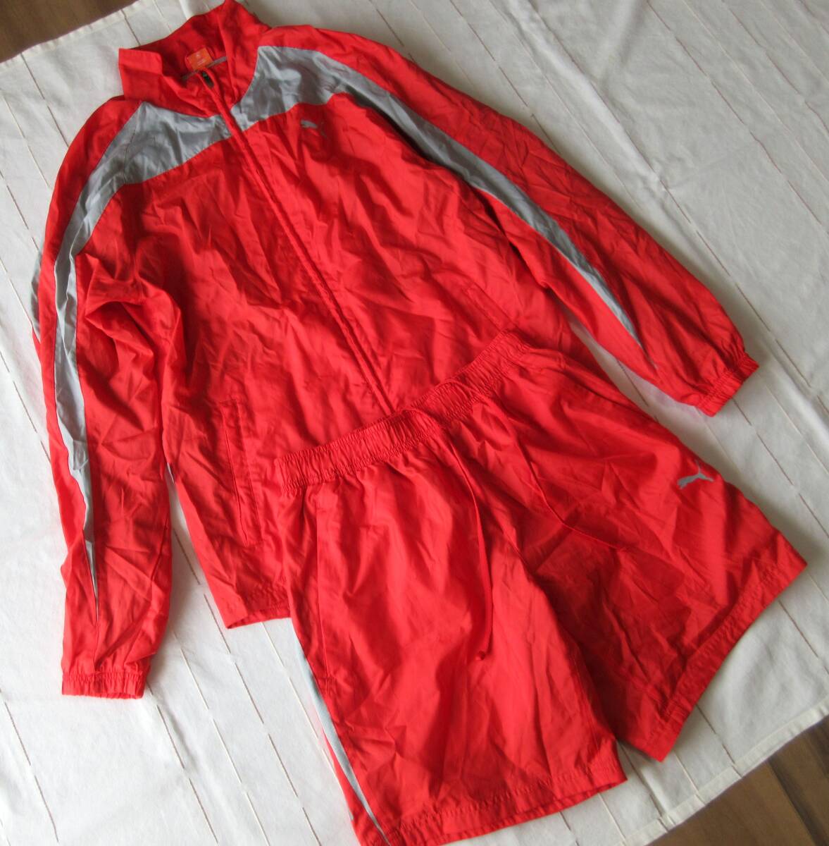 > PUMA プーマ メンズM L ウィンドブレーカー 裏地メッシュ ショートパンツ セットアップ ジャージ 赤×グレー スポーツウェア 上下セット