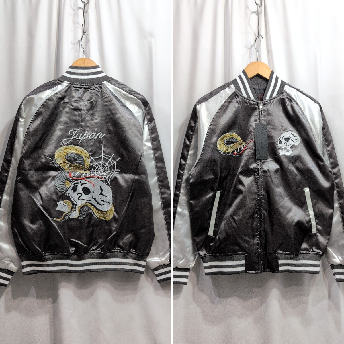 - 【新品/タグ付き】一心如鏡 蛇×髑髏 刺繍 サテン スカジャン M メンズ グレー スーベニアジャケット 検(東洋/絡繰/抜刀娘/百花繚乱①