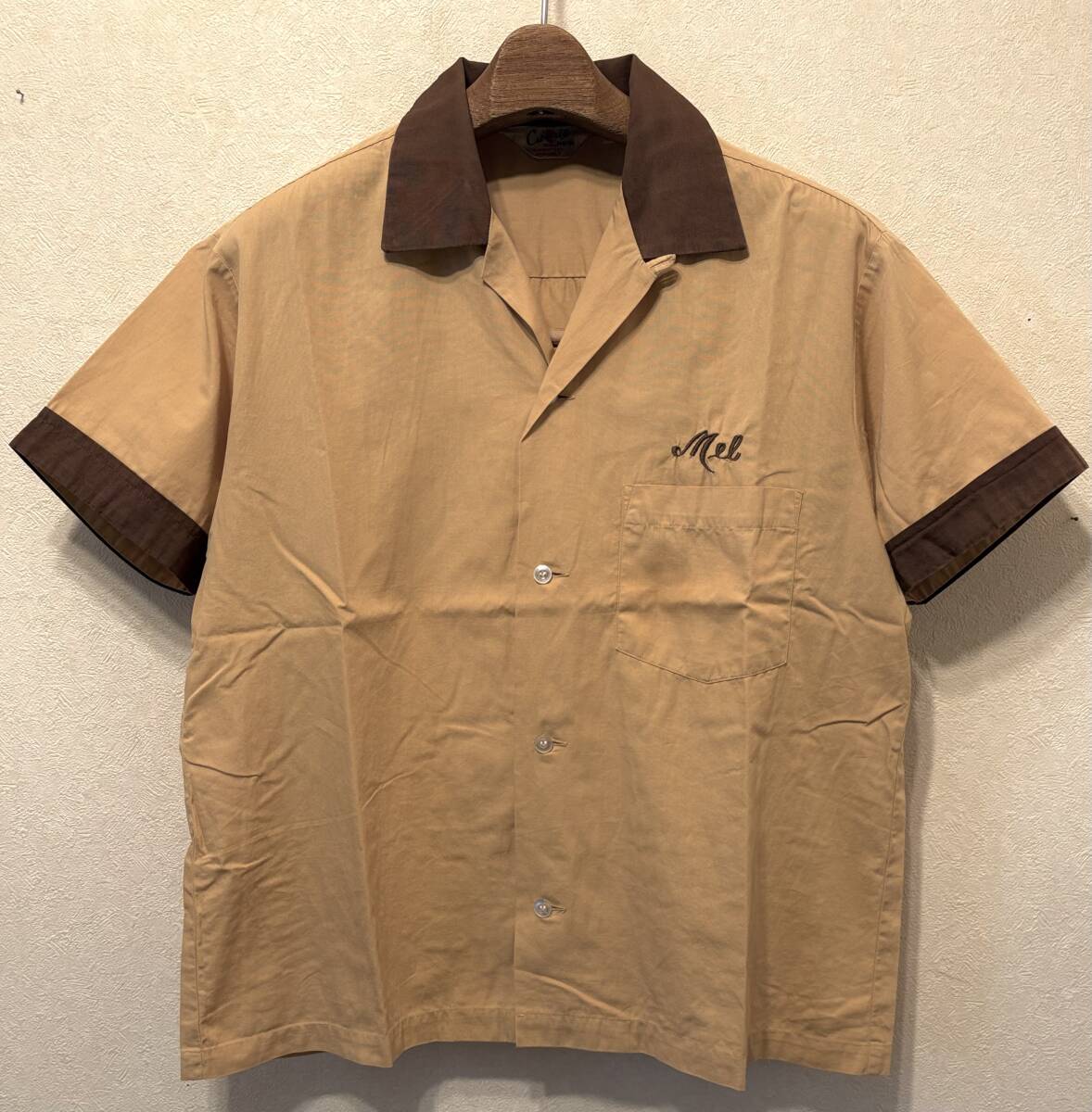 > 60sビンテージ開襟ボーリング半袖シャツMオープンカラー黄コットン?茶ツートン2トーン2toneバックプリント刺繍ネームUSA製US製60年代1960s