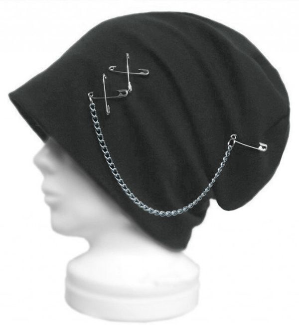 > ◇送料無料◇ ハンドメイド◆パンク[チェーン&ピンクロス付]ルーズワッチキャップ◆コットンニット/黒 ◇ゆったりサイズ・小顔効果◇