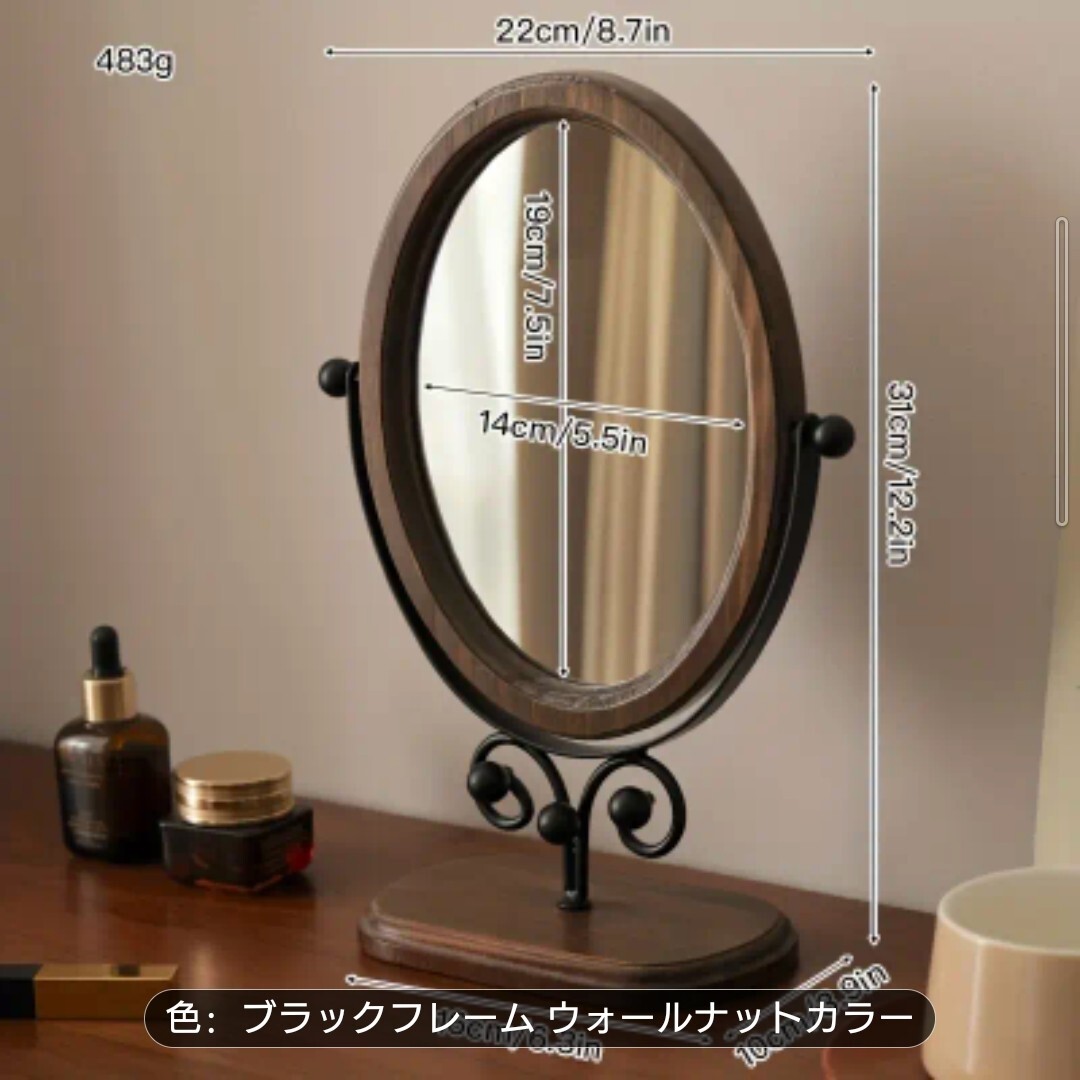 - ビンテージウッドメイクアップミラー 調整可能回転デスクトップ化粧鏡 高品質ガラス 頑丈アイアンフレーム ブラックフレームウォールナット