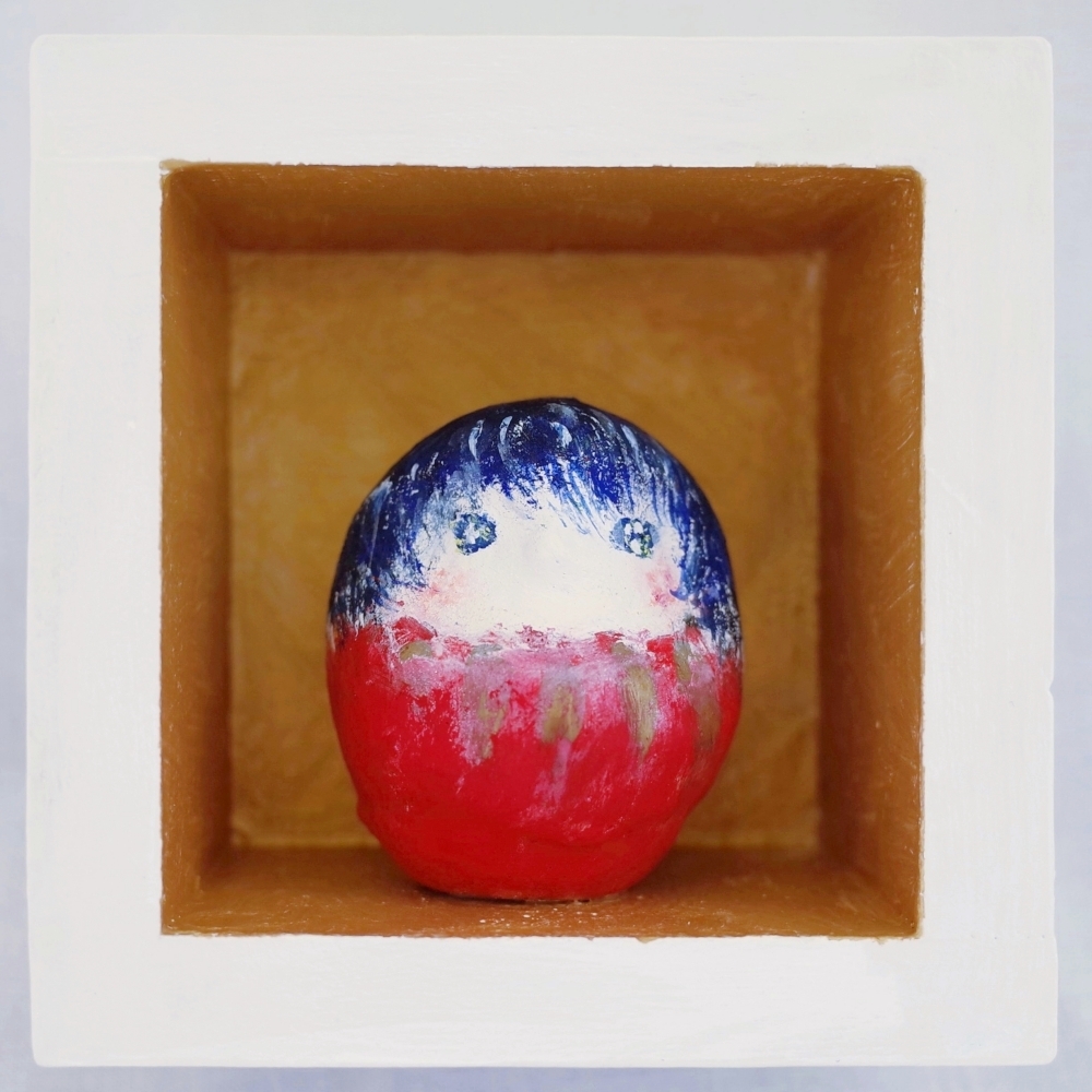 - 内野隆文 だるま姫 オブジェ 立体作品 彫刻 古い達磨・一合枡・アクリル 現代アート 古道具 ヴィンテージ