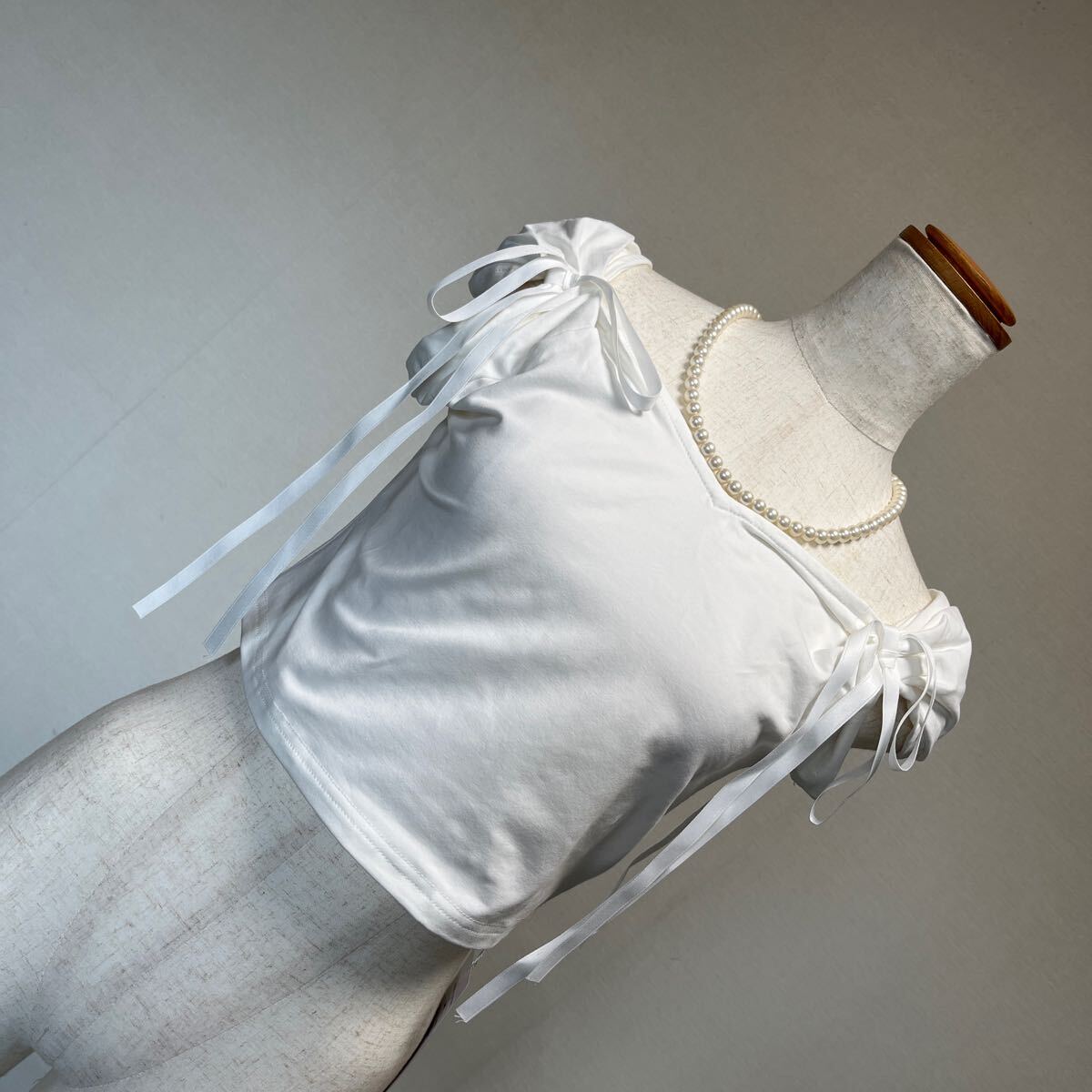 - 7-7新品 ドロストショルダーリボンカットソートップ ショート丈クロップドチビTミニTシャツ[韓国ファッション ]オフホワイト9号 M