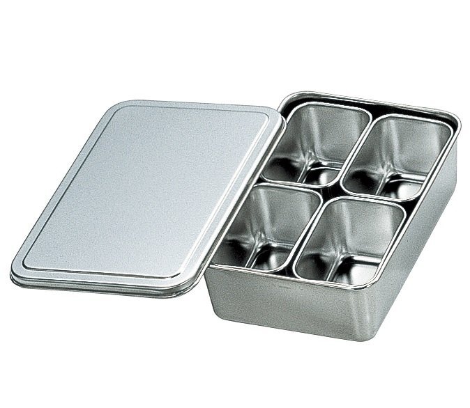 - ★ヤクミ入調味料入バット4ヶ入ミニ角型アイデア次第で使い方いろいろ料理や珍味等を小分けにそのまま食卓へ18-8ステンレスプレス加工