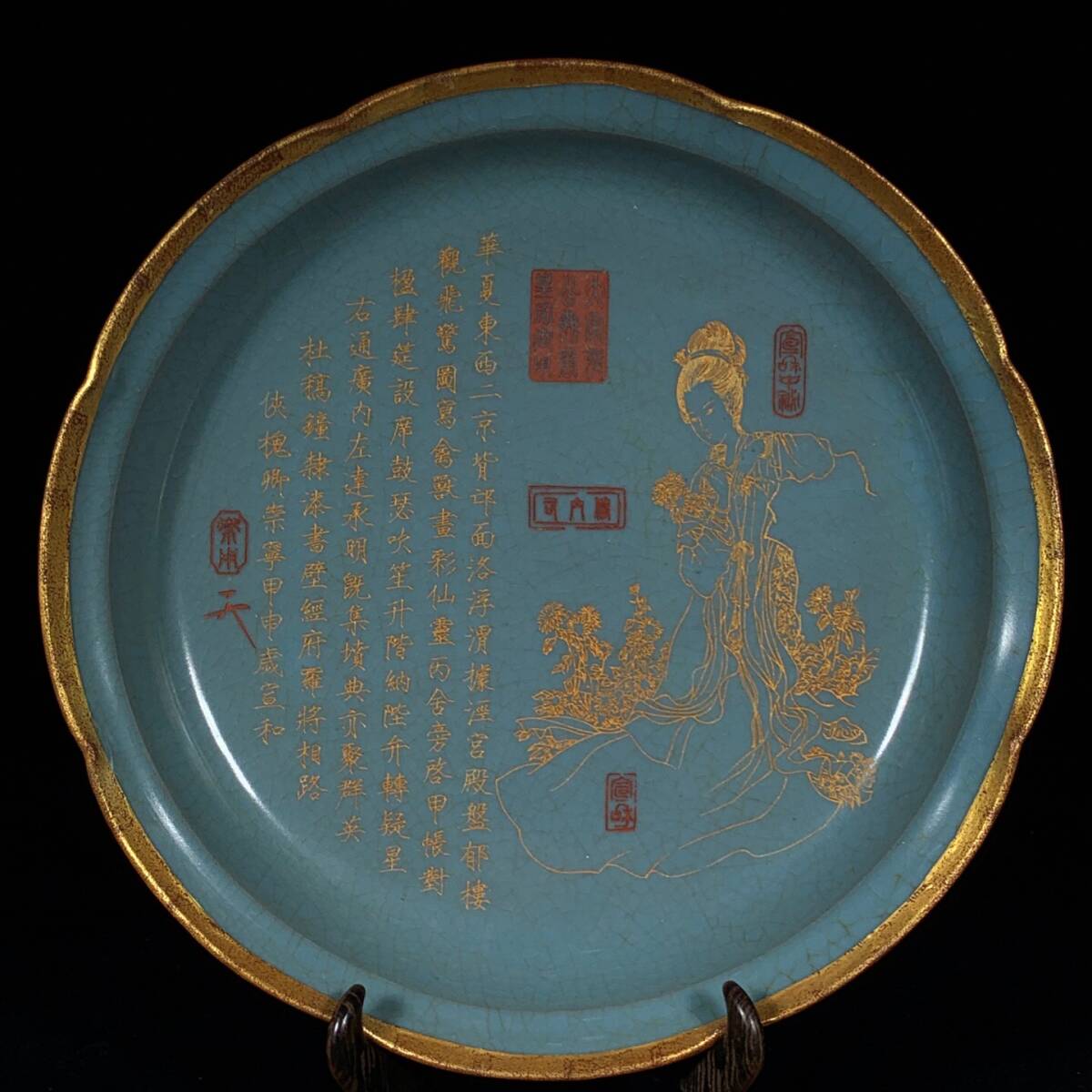 > 蔵友旧蔵出 宋 汝窯 包口 銘文 仕女紋 花口盤 稀少珍品 貴重品 古陶瓷品 置物 古賞物 中国古玩 中国古美術品