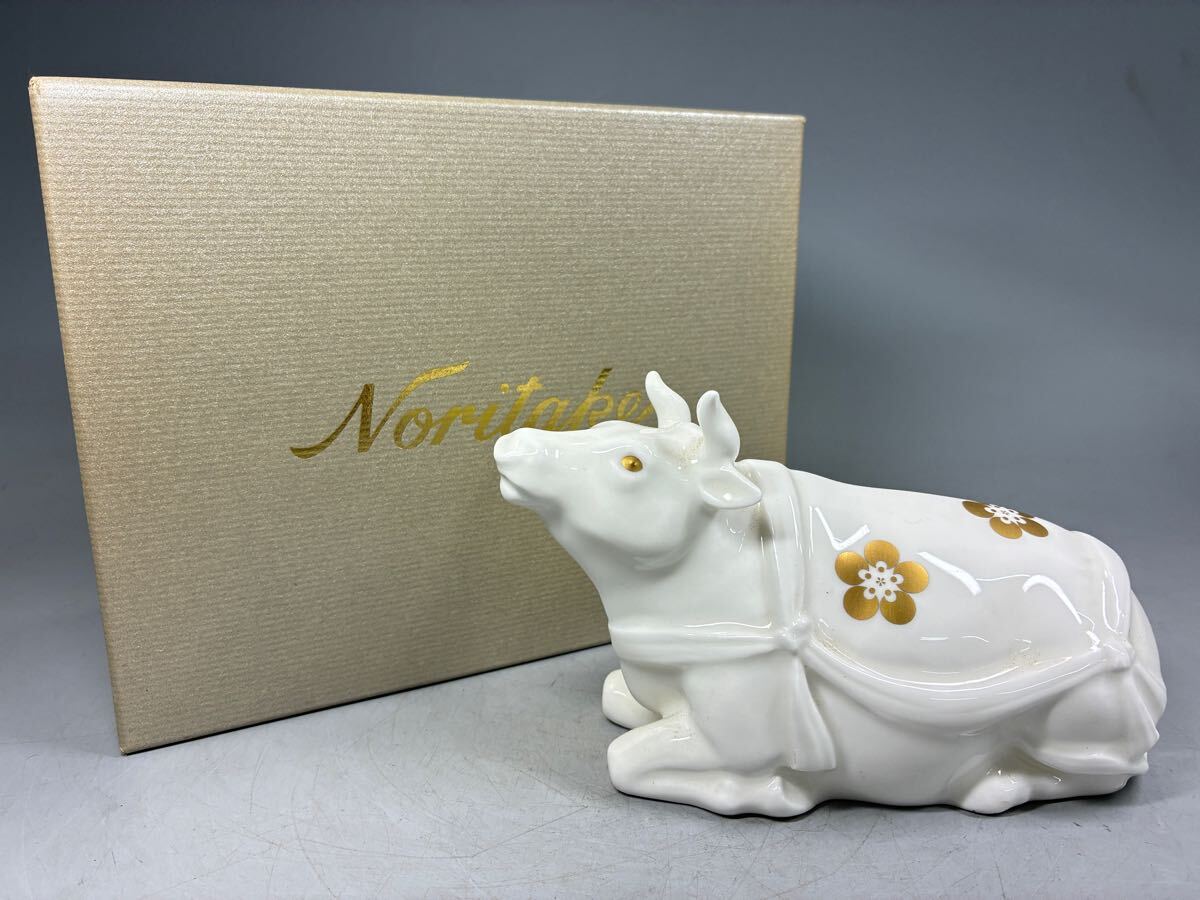 > Noritake ノリタケ 干支置物 牛 白磁 金彩梅紋 ボーンチャイナ フィギュリン 人形 牛置物 丑 箱付 美品 動物 アニマル 陶器人形 古美術品