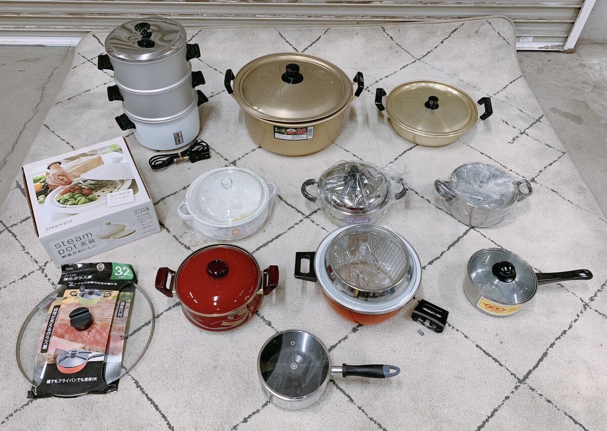 > 美品 鍋 まとめて なべ ナベ 両手鍋 蓋 調理器具 steampot 蒸鍋 アルミ鍋 ガラス蓋 調理道具 店舗 業務 引取歓迎 茨城 0625か2 K 140×2