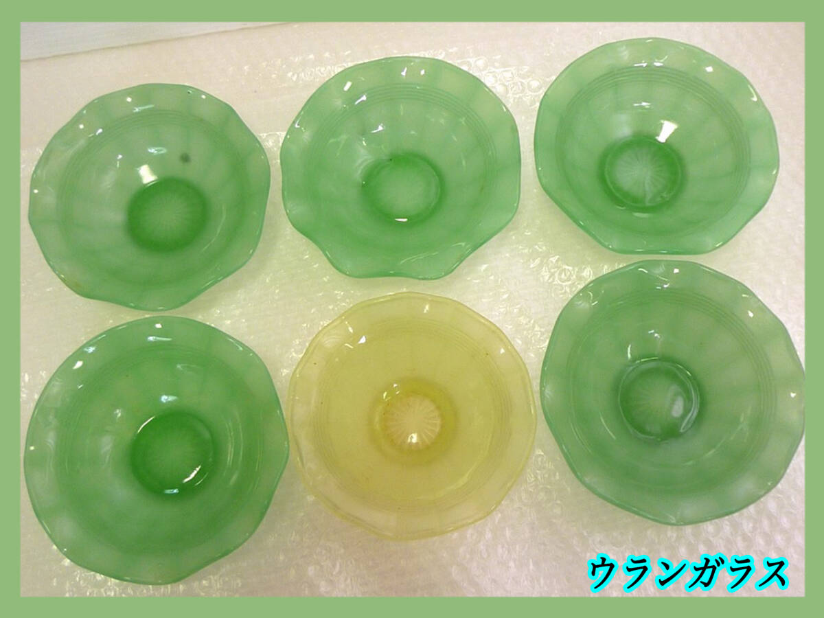 > 旧家蔵出 激レア 昭和レトロ 昭和初期頃 ウランガラス デザート皿 6枚セット ガラス 6個 蛍光 発色 緑&黄色 吹き硝子 大正ロマン 気泡