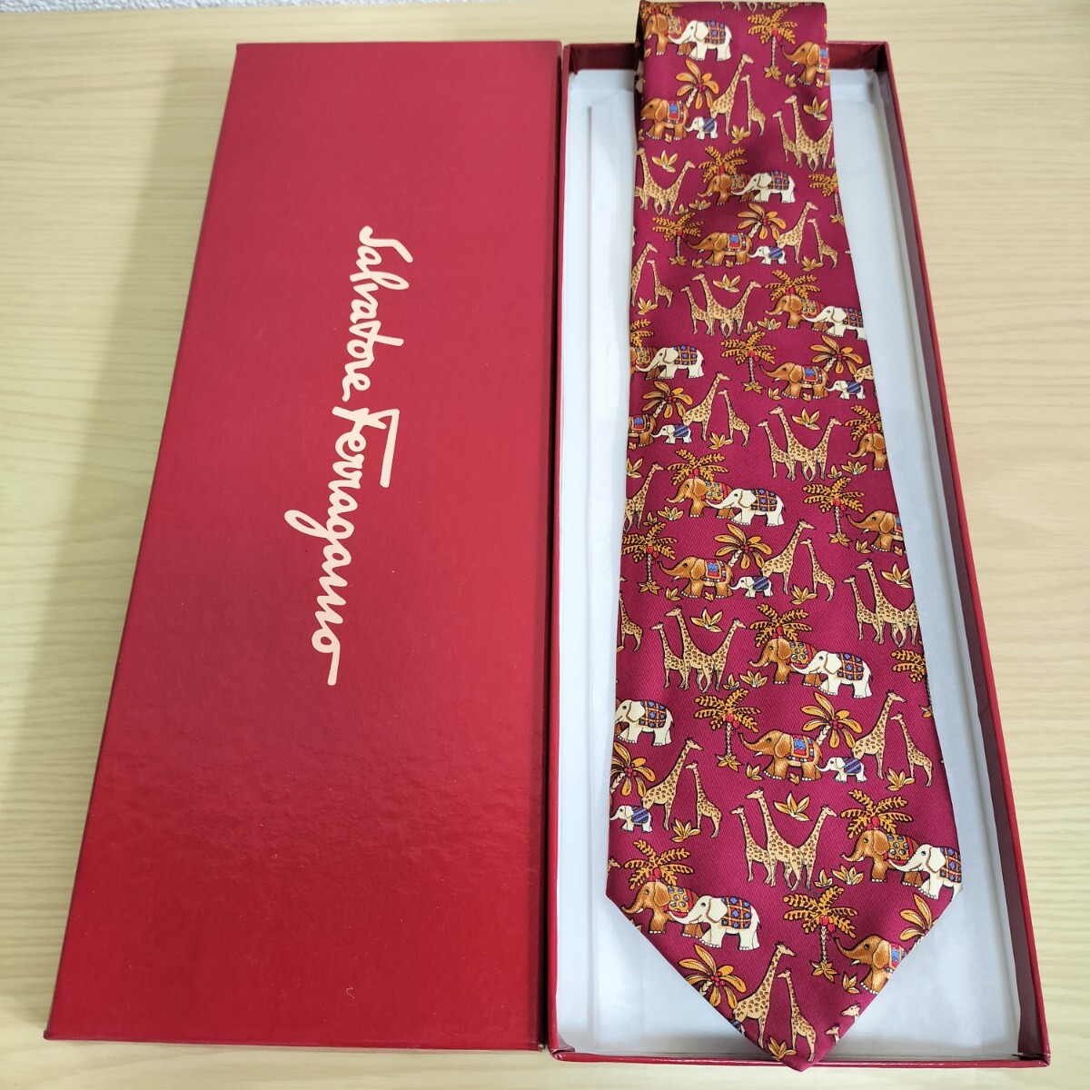 > Salvatore Ferragamo(サルヴァトーレフェラガモ)赤キリンゾウさん椰子の木模様ネクタイ