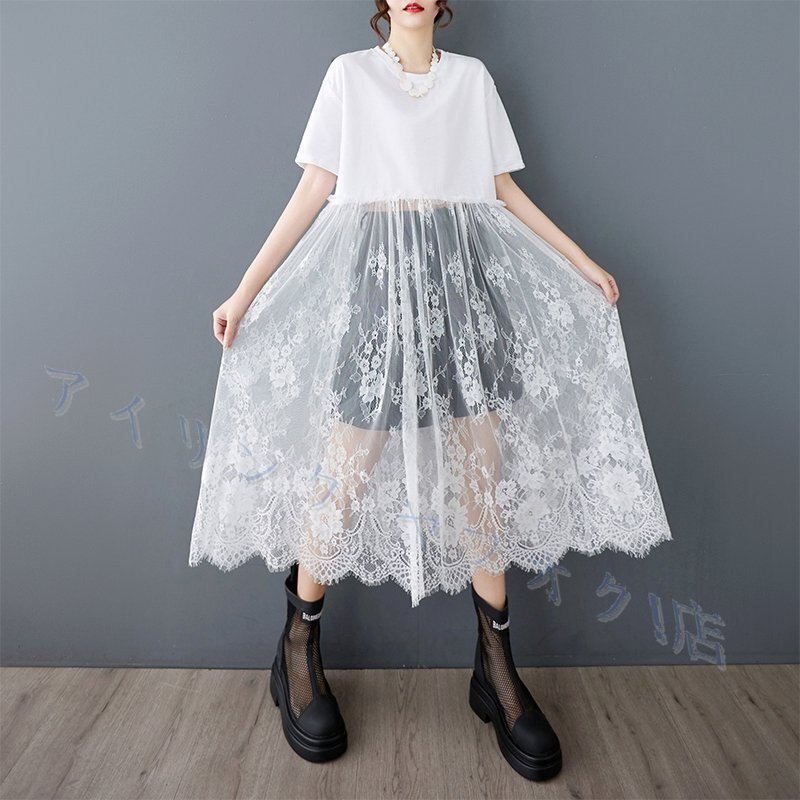 - 新品★夏 カジュアル 20304050代 ゆったり大きいサイズ おしゃれレース切り替え 透け感 半袖ロングワンピース 白