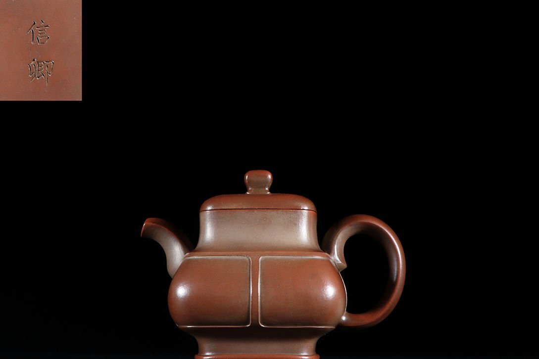 > ▼渡鶴羽▼R1092時代朱泥 四方執壺紫砂壺 在銘 陳信卿 明代/紫砂 煎茶道具 朱泥 茶壺