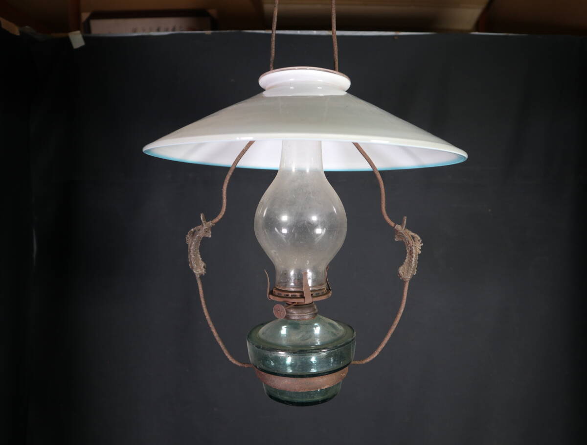 - 吊りランプ・白地に青色縁取り・オイルランプ・当時物・昭和レトロ