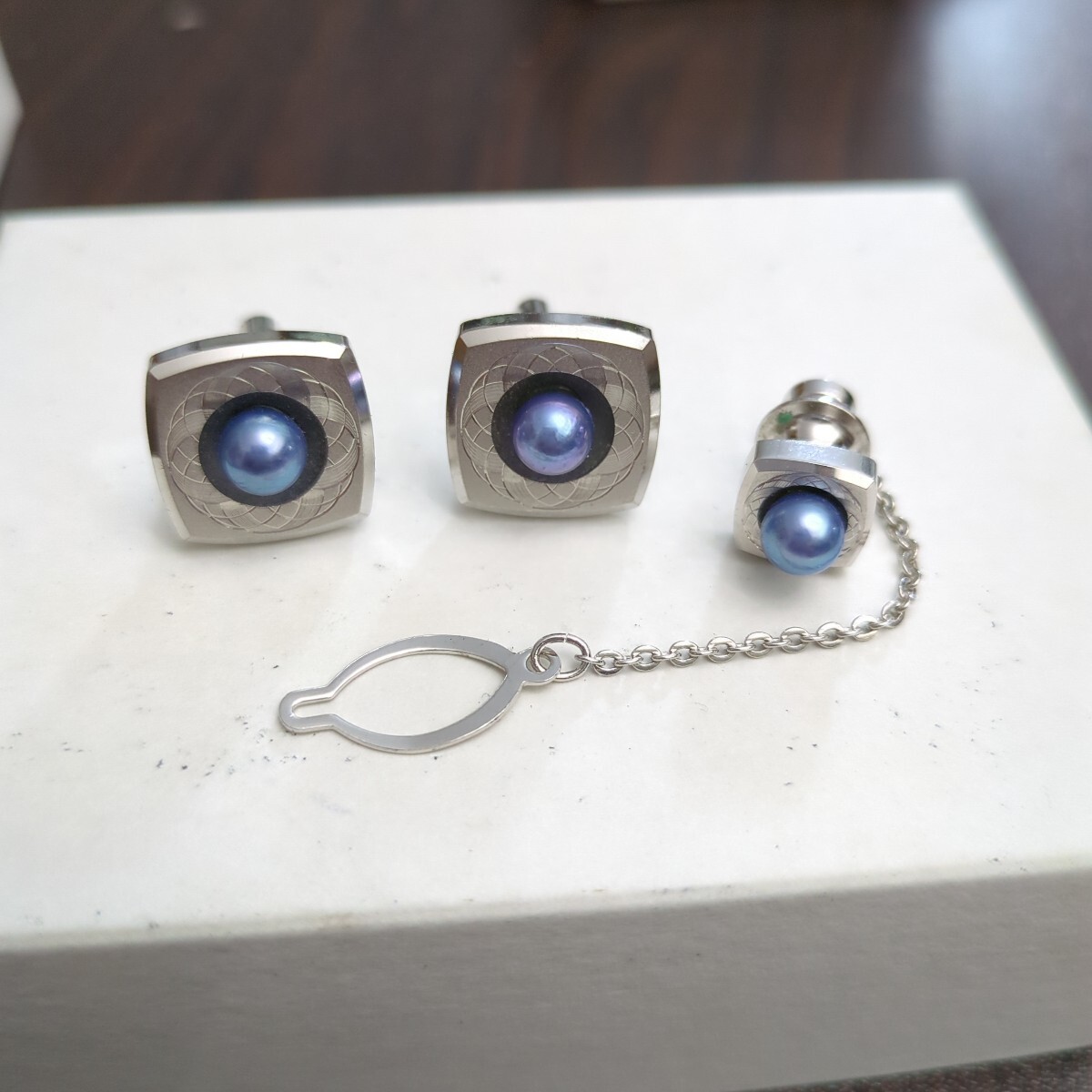 - カラーパール ネイビー カフスボタン ネクタイピン セット アクセサリー シルバーカラー