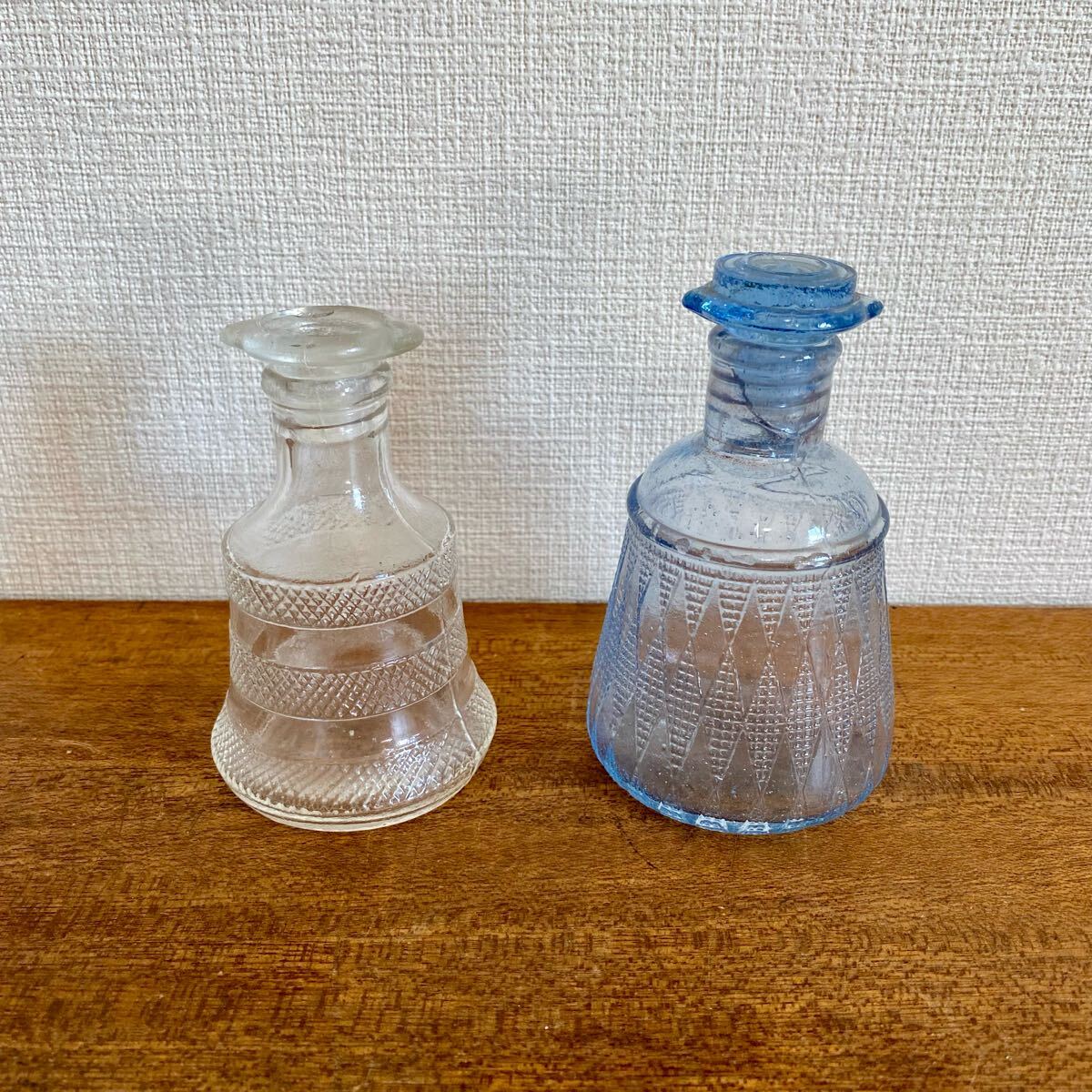 - アンティーク 古い醤油瓶 ガラス瓶 ブルー クリア系 2点セット / 硝子 気泡ガラス 醤油差し 模様 昭和レトロ