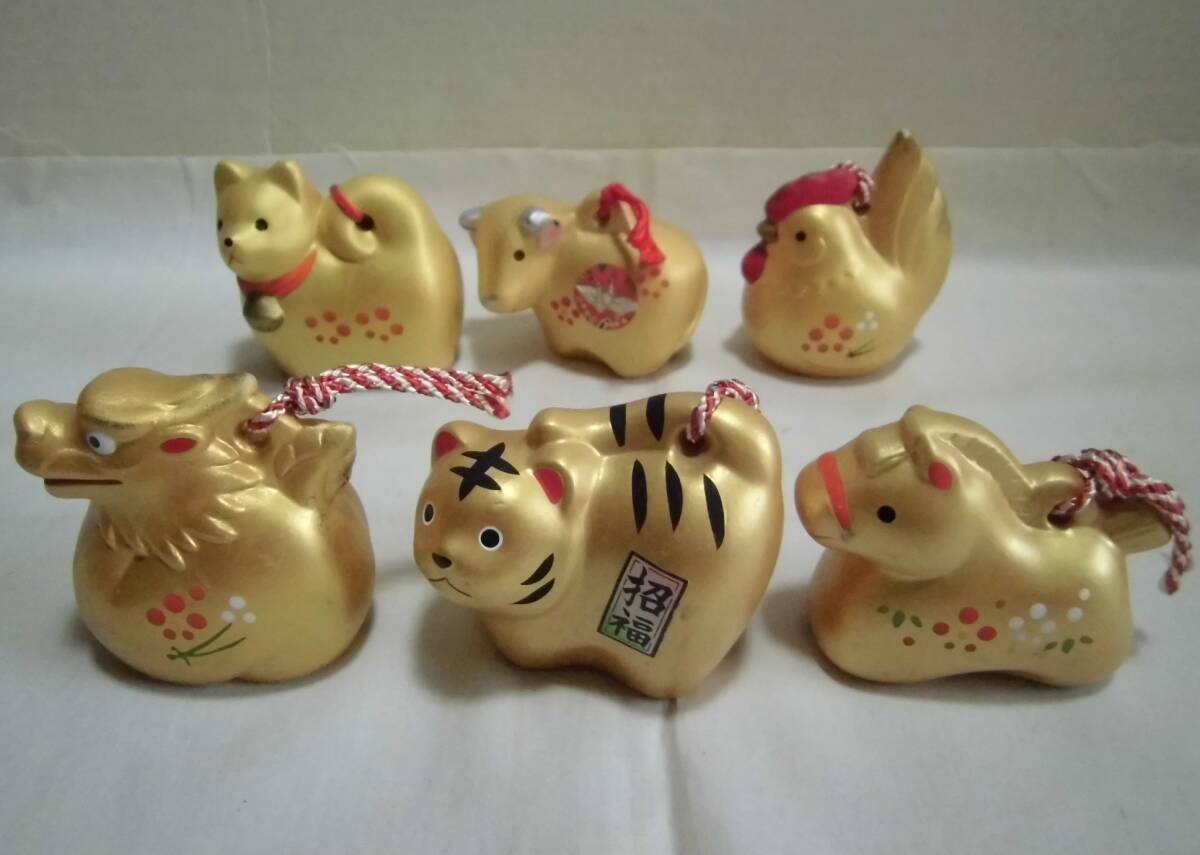 - 土鈴 金色 干支置物 6点 薬師窯 昭峰 丑 寅 辰 午 酉 戌 牛 虎 龍 牛 鶏 犬 十二支 土人形 伝統工芸品 郷土玩具 置物 飾り物 開運 縁起物