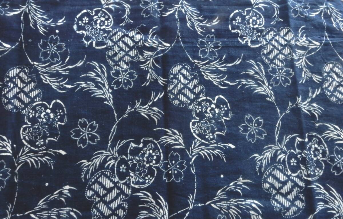 - <銀の斧>木綿・明治期・藍中型染生地ハギレ・手織藍染布・福雀に桜!