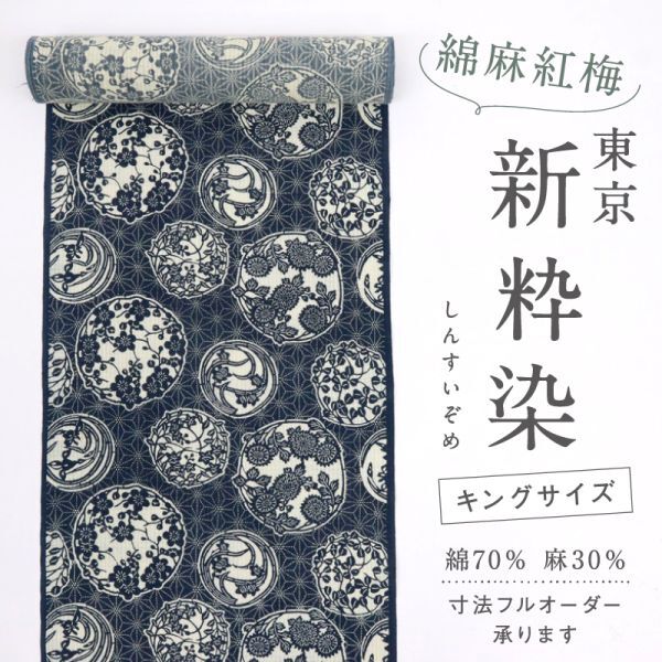 - 【反物】 『新粋染』 綿麻紅梅 小紋 麻の葉に花の丸文 夏着物 お仕立て可 反25-44