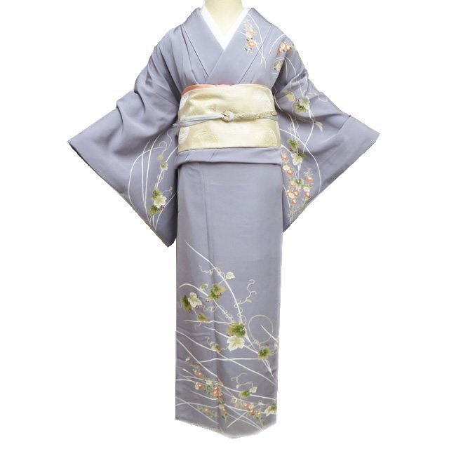 > 特選 訪問着 着物 中古 正絹 袷 フォーマル 金駒刺繍 花の図 蔦に菊 薄鈍色 多色 金 身丈159.5cm 裄67.5cm M きもの北條 A1225-10