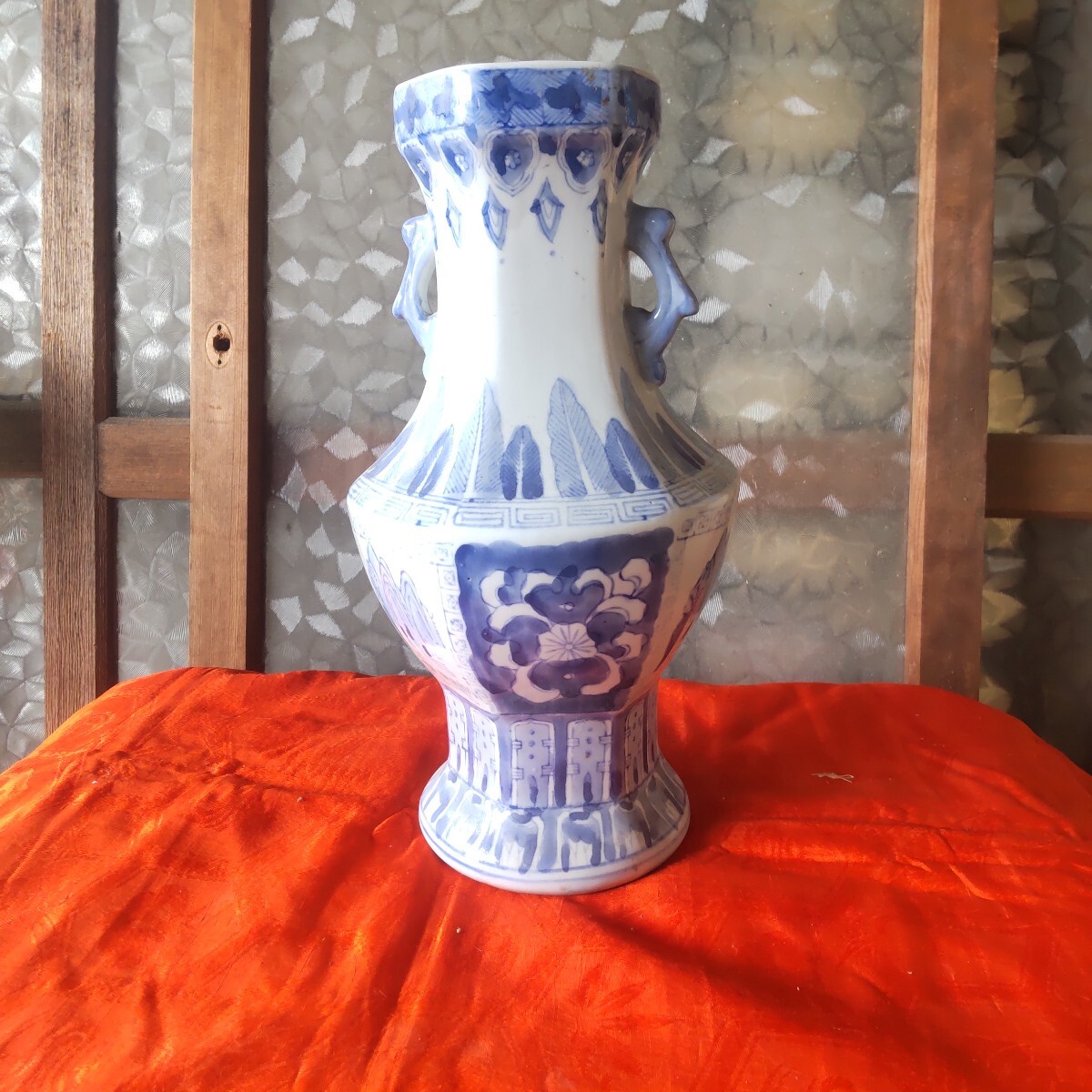 - 骨董品中国青花双耳山水花瓶 置物 花器 陶磁器30cm