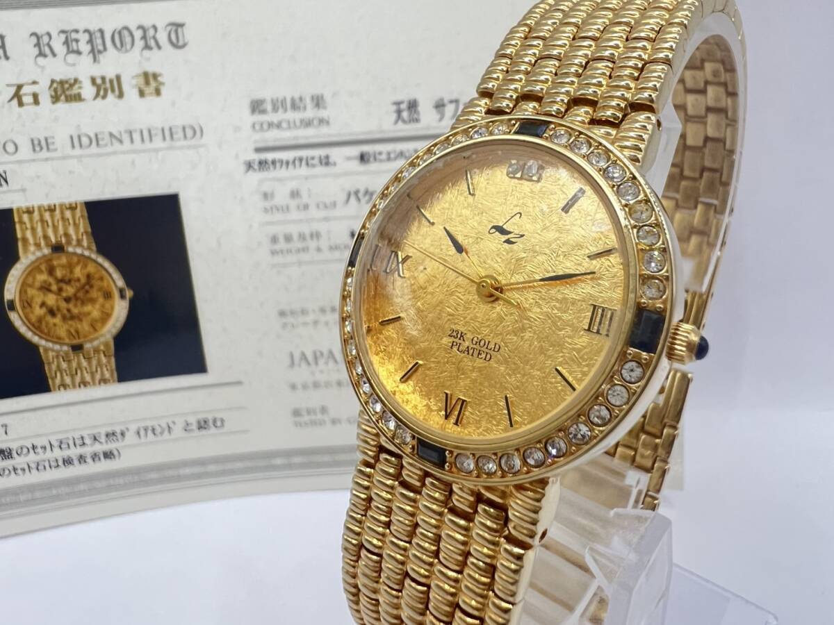 > B) LZ 男性用 メンズ 腕時計 ゴールド 23KGP ストーン QZ 鑑別書付き【電池交換済】D171i