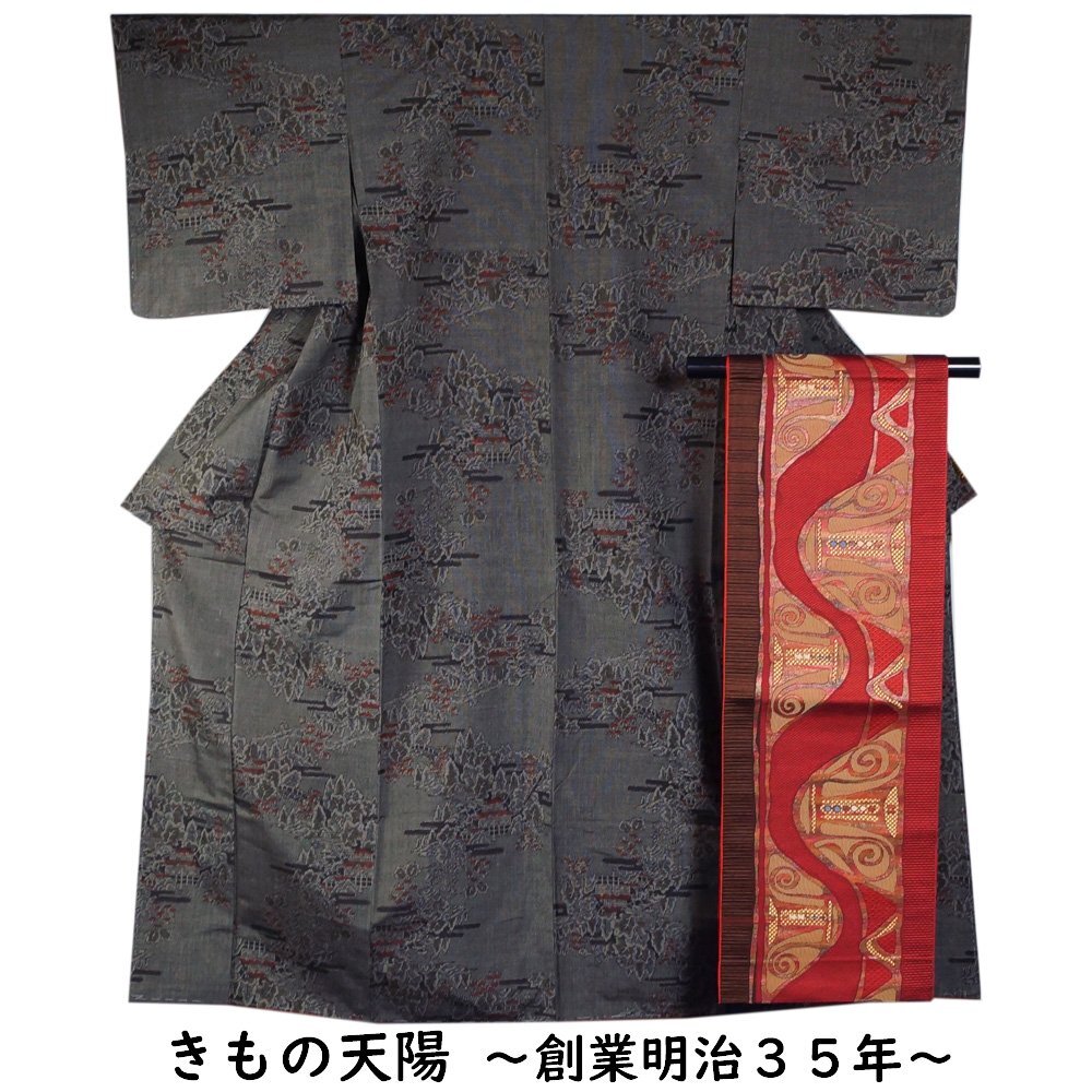 - 着物セット 紬・八寸名古屋帯 2点 セット お屋敷庭園模様 Sサイズ 紬 中古 着物 リサイクル着物 リサイクル紬 正絹