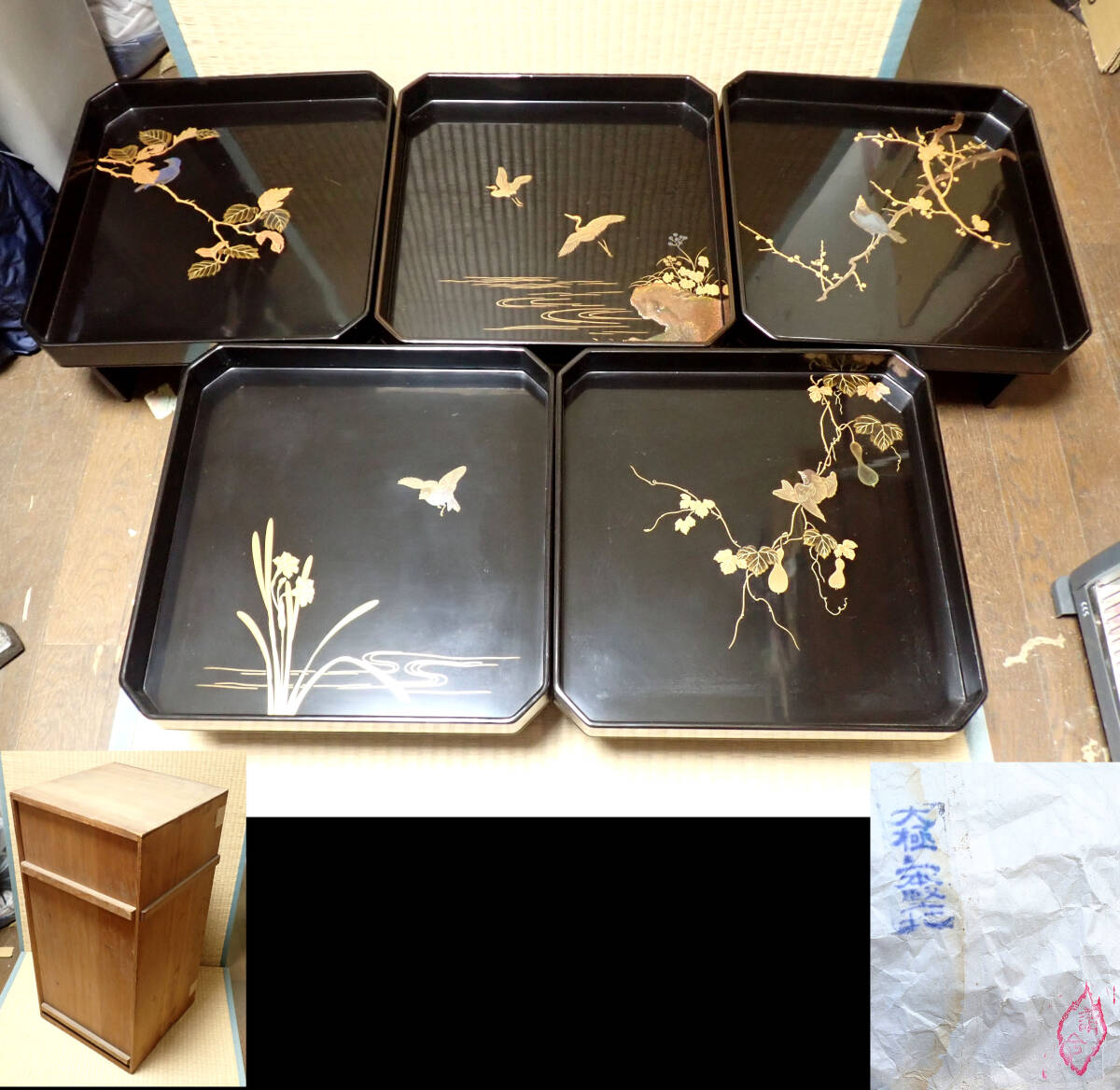 > 時代【木製漆器 大極二本堅地 図替り金蒔絵 花鳥図 御膳 5客 共箱付きB】輪島塗 絵変わり 高足御膳 お膳 会席料理 茶会席膳 漆芸
