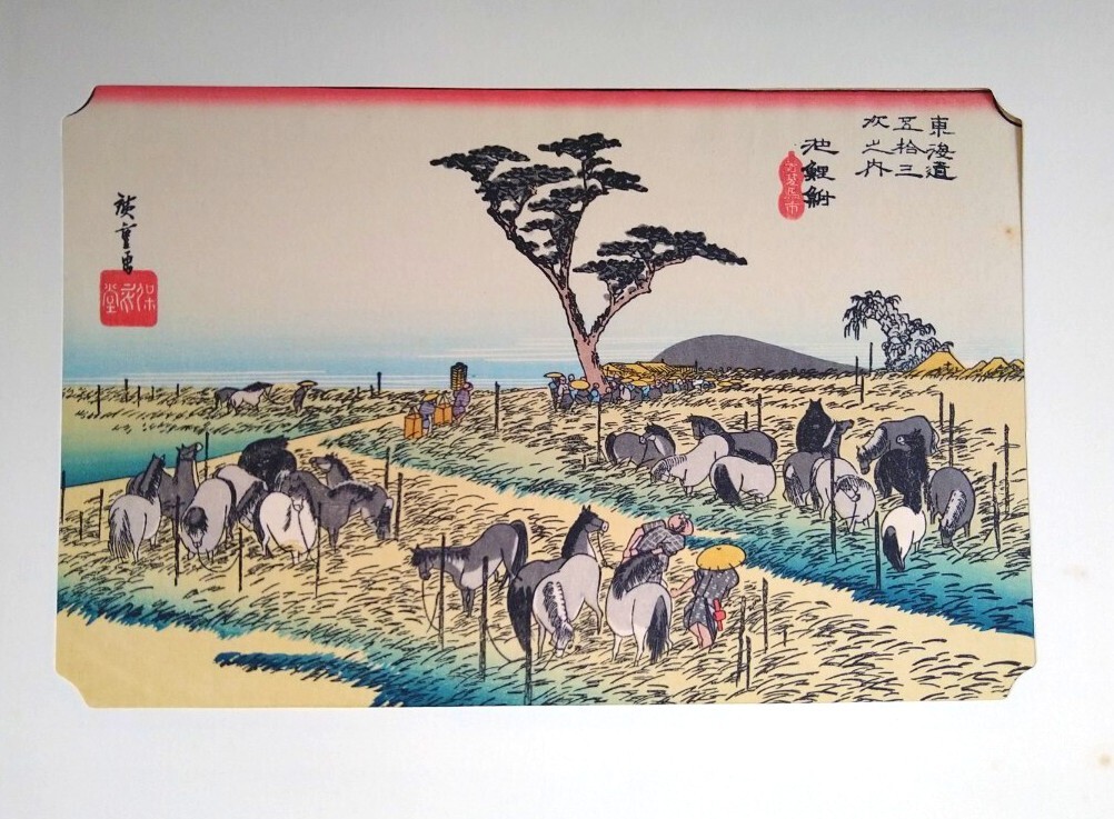 - 【浮世絵3点セット】歌川広重 東海道五十三次 「池鯉鮒 首夏馬市」「岡崎 矢矧橋 」「藤川 棒鼻図」木版画 高見沢研究所 真作 べらぼう