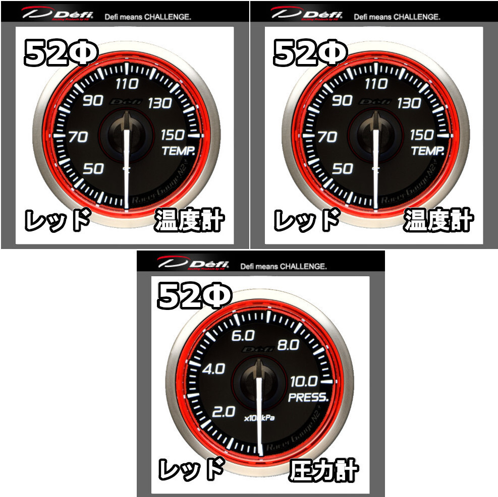 - DEFI デフィ レーサーゲージN2プラス 3点セット 水温計+油温計+油圧計 52φ レッド 文字盤:黒(文字:ホワイト)