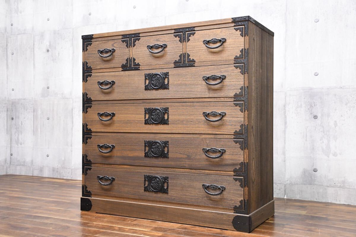 - EFK86 焼桐調うづくり時代仕上げ 牡丹 ハイチェスト 5段 桐たんす 桐箪笥 肥前桐民芸 国産品 和タンス 桐タンス 整理箪笥 民芸箪笥 和家具