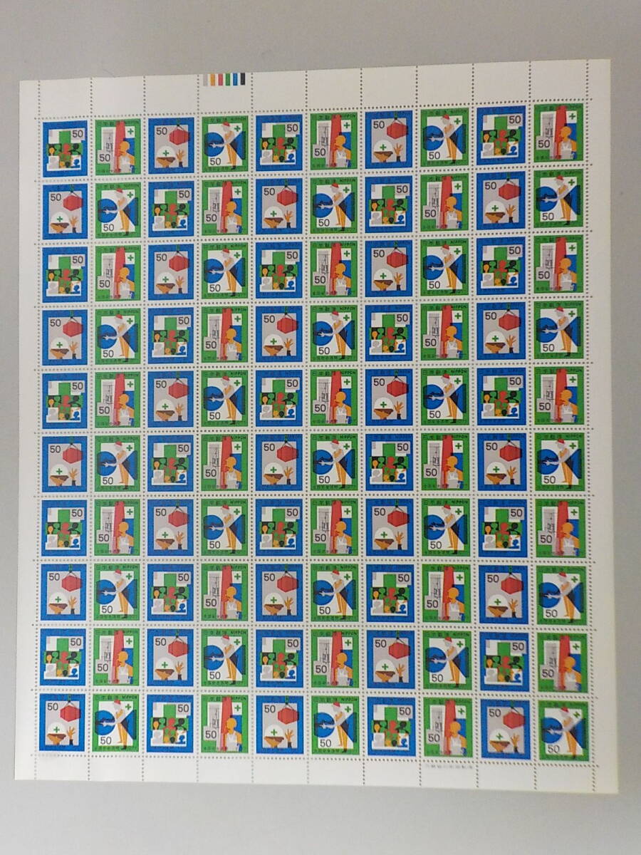 - 全国安全週間 1977年 安全マークと働く人々 高層建築作業とその安全 / 50円切手 100面シート 未使用