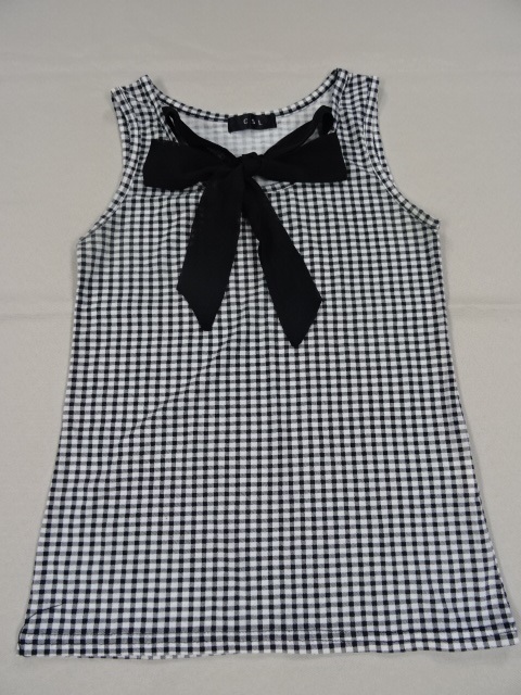 > CSL タンクトップ ノースリーブ レディース トップス チェック S 黒×白 リボン 古着 USED シンプル 可愛い おでかけ 普段使い