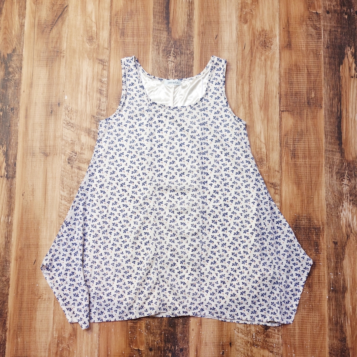 > 美品 シューラルー SHOO-LA-RUE 花柄ノースリーブチュニック レディース Aライン 裏地付き 体型カバー Sサイズ ホワイト系小花柄 LM40