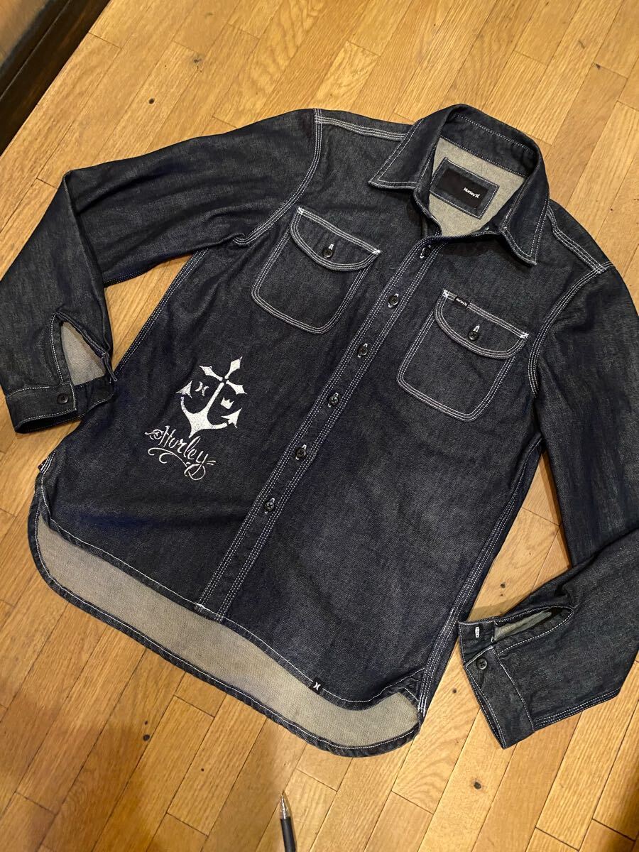 > 美品レアHurleyデニムジーンズシャツジャケットカバーオールダンガリーワークウエスタン長袖ペイントロゴ刺繍バイカーライダーインディゴ