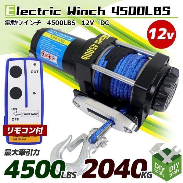 - 電動ウインチ ◆ロープタイプ 12V◆ 小型 有線 無線 リモコン付き 牽引巻き上げ 最大牽引4500LBS (2040kg )
