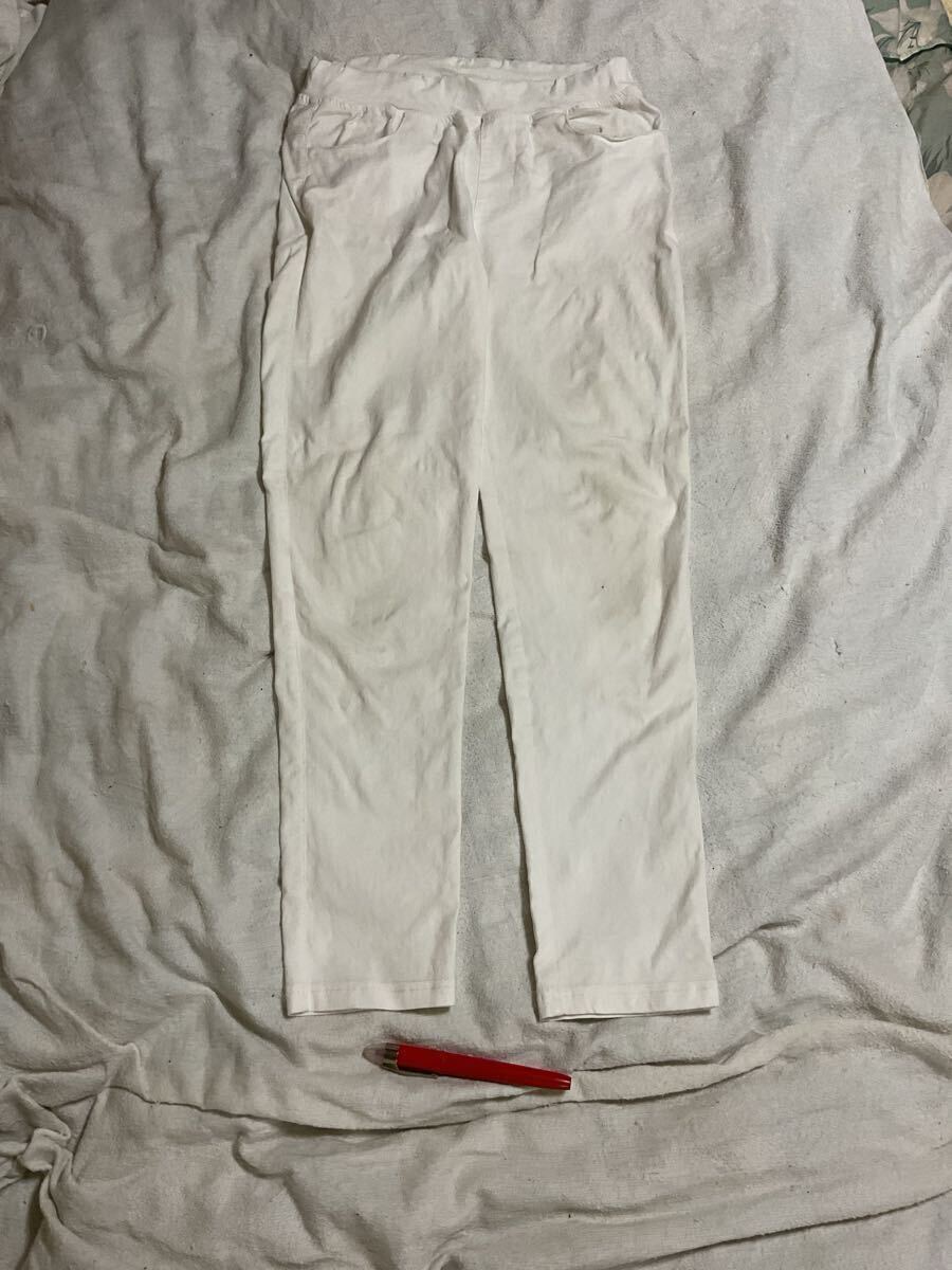> ズボン 500円超10%オマケ M-L H87-100wゴム64-77実w68-92全90平置股下68cm 開閉無 レーヨ70ナイ25ウレ5% 薄手 ポケ4 膝薄汚れ 白 中国